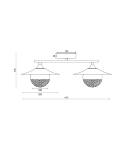 Елегантен и актуален плафон, изработен от черен цвят метална основа и рамо с две кръгли матиран месинг чашки с матирани сферични стъклени разсейватели на цокъл G9. Плафон, перфектен за осветление във вашиявсекидневна, трапезария, хотел и ресторант.