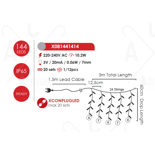 Празничен светодиоден светещ гирлянд с висулки, изработен от бял цвят силиконов кабел с 144бр. LED постоянно светещи чипове с мощност 10,2W, 2700K, с дължина: 3000мм, и 24бр светещи висулки на разстояние 125мм, с дължина: 600мм и висока степен на влагозащита: IP65, дължина на захранващия кабел: 1500мм. Може да се съединят до 20бр гирлянди на едно захранване. Гирлянд, перфектен за декоративно интериорно и екстериорно осветление за вашия дом, офис, хотел и ресторант.