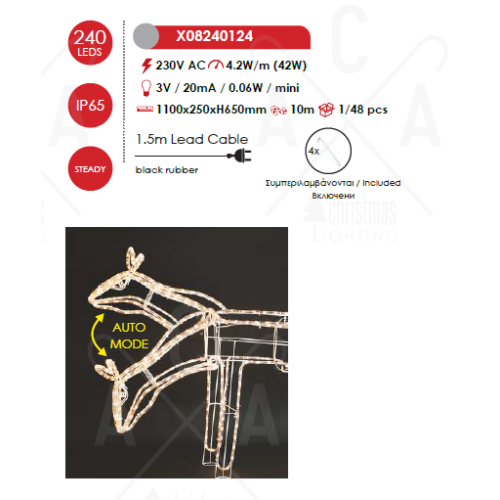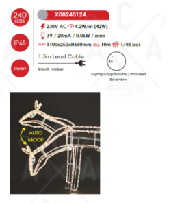Оригинална LED коледна декорация, изработена от метална фигура във формата на северен елен с подвижна глава и светещ маркуч с 240 LED постоянно светещи чипа с мощност 42W, 2700К с висока степен на влагозащита: IP65 и включени крепежни елементи. Стилно предложение за екстериорната коледна украса на вашия дом, вила, хотел и заведение.