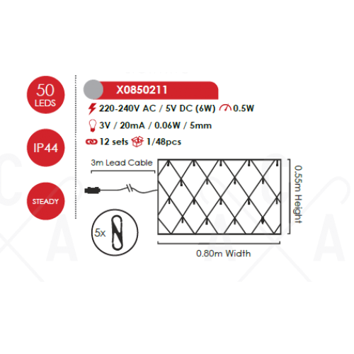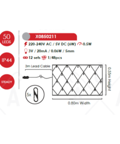 Празничен светодиоден светещ гирлянд като мрежа, изработен от зелен цвят PVC кабели и 50бр. LED постоянно светещи чипове с мощност 0.5W, 12000К, с широчина: 800мм, височина: 550мм и дължина на захранващия кабел: 3000мм с висока степен на влагозащита: IP44. Могат да се съединят до 12бр. гирлянди на едно захранване. Гирлянд, перфектен за декоративно интериорно и екстериорно осветление на вашия дом, офис, хотел и ресторант.