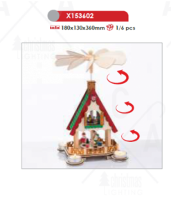 Атрактивна коледна декорация във формата на коледен свещник, изработен от многоцветна дървена къщичка с пързалка за кънки на лед, задвижвана от оригинална дървена перка на върха и четири прозрачни чашки за чаени свещи. Класическо предложение за коледната украса във вашия дом, вила, хотел и заведение.