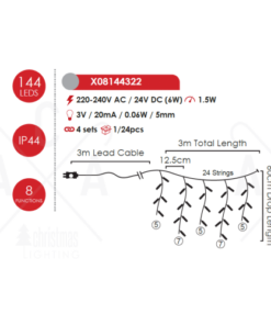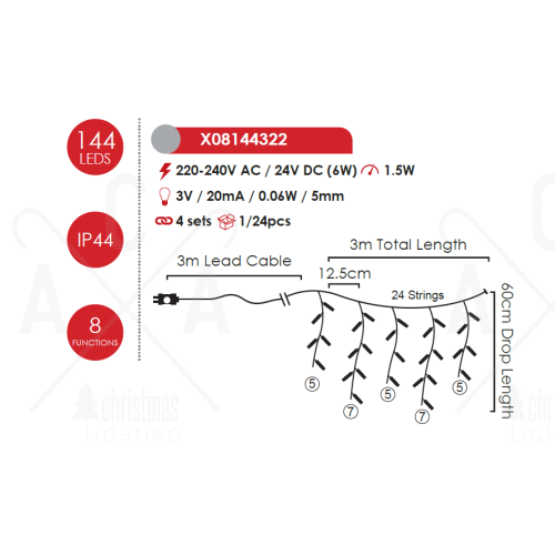 ACA LIGHTING CHRISTMAS X08144322 144 LED ICICLE LIGHT, MULTICOLOR, ADAPT. (31VDC), CONNECT. (MAX 4) & 8 FUNCT.,IP44, 300x60cm, TRANS/NT CABLE