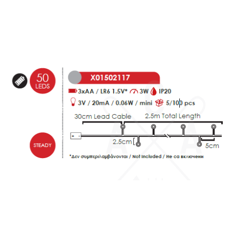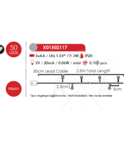 Празничен светодиоден светещ гирлянд, изработен от сребрист цвят меден кабел с 50бр. LED светлини и мощност 3W, 6000K, работещ на батерии 3бр. х АА (не са вкл.). Гирлянд, перфектен за декоративно осветление на вашия дом, офис, хотел и ресторант. МИНИМАЛНО КОЛИЧЕСТВО ЗА ПОРЪЧКА: 5бр.