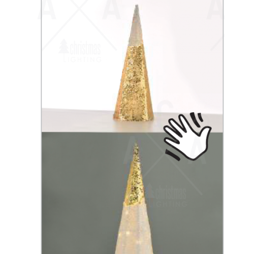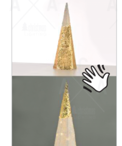 Оригинална LED коледна декорация във формата на коледно дърво, изработена от конусовидна форма конструкция, покрита с текстил и декоративни пайети в бял и златист цвят с 35 LED чипа, с мощност 1,58W, 3000К, работеща на батерии 3 бр. х АА (не са вкл.). Коледна украса, перфектена за декоративно осветление на вашия дом, вила, хотел и ресторант.