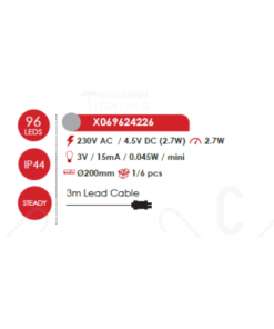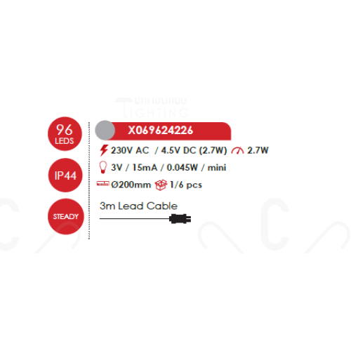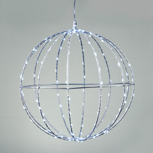 Оригинална LED коледна декорация, изработена от висяща на прозрачен PVC кабел 3D сребриста метална топка с медна жица и 96 LED постоянно светещи чипа с мощност 2.7W 12000К и дължина на захранващия кабел: 3000мм с висока степен на влагозащита: IP44. Стилно предложение за екстериорната коледна украса на вашия дом, вила, хотел и заведение.