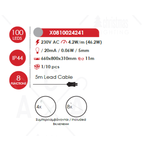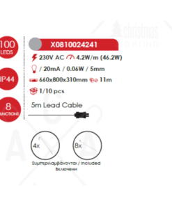 Атрактивна LED коледна декорация, изработена от метална фигура на северен елен с бял цвят PVC светещи гирлянди и 100 LED чипа с 8 програми на осветеност и мощност 46.2W 12000К с дължина на захранващия кабел: 5000мм и висока степен на влагозащита: IP44 с включени крепежни елементи. Стилно предложение за екстериорната коледна украса на вашия дом, вила, хотел и заведение.