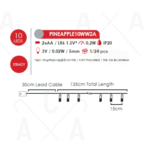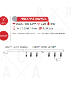 Празничен светодиоден светещ гирлянд, изработен от прозрачен кабел и златист цвят декоративни метални елементи във формата на ананаси с 10бр. LED светлини и мощност 0,2W, 3000K, работещ на батерии 2 бр. х АА (не са вкл.). Оригинална декорация, перфектена за модерното осветление на вашия дом, офис, хотел и ресторант.